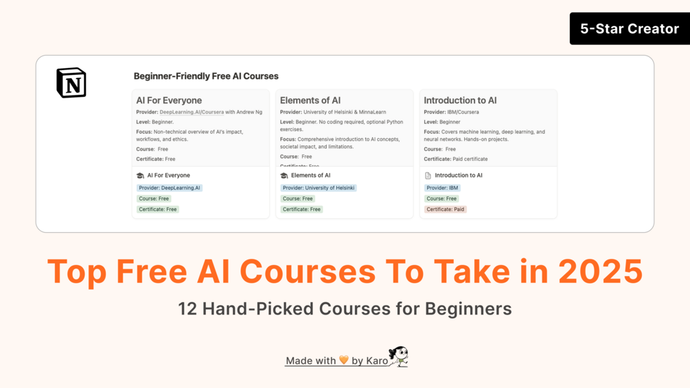 Looking for the best free AI courses in 2025? This curated Notion guide includes 12 top picks from Google, IBM, Harvard, and more. Perfect for beginners, ethical tech explorers, and curious product folks.